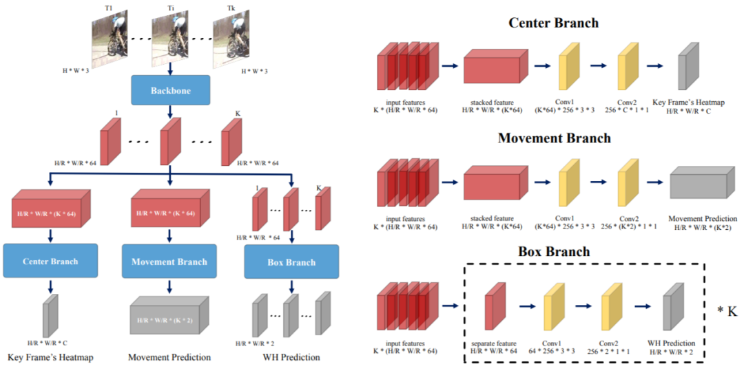 具体来讲,首先将连续K帧图像分别输入共享的2D Backbone提取每一帧的高层语义特征,即K张特征图,然后由三个分支共同协作来完成时空动作检测,我们的网络结构如下图: