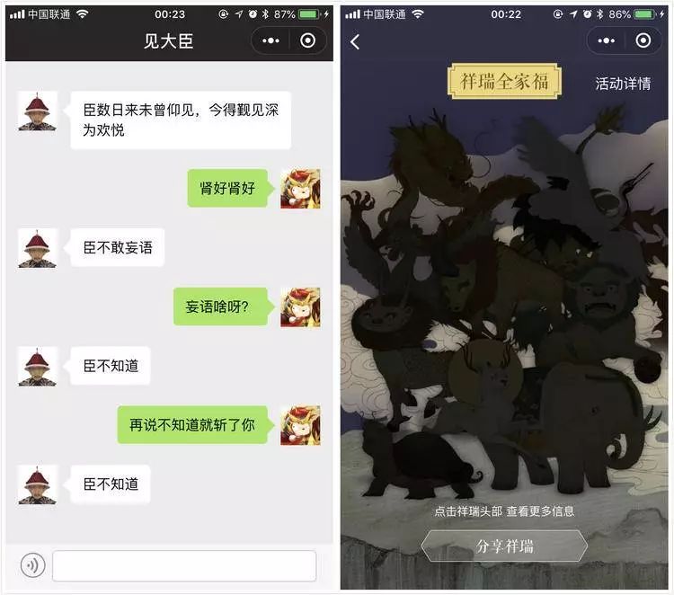 「玩转故宫」小程序中将真实的景点还原到了手机地图上,全面覆盖了游客在故宫游览时的各项需求,包括地图导航、票价、解说、路线规划等。在重要的建筑地点打卡后,游客可以获得精美的祥瑞卡,可以解锁相应的小故事,还能一键分享自己的旅游经历。 还有一个有趣的小游戏,你可以扮演皇帝和大臣对话,大臣背后其实是 AI 机器人,所进行的回复也是基于历史典故。这种恶趣味的小游戏可以说是个彩蛋,把严肃的历史博物馆也搞得十分有趣。