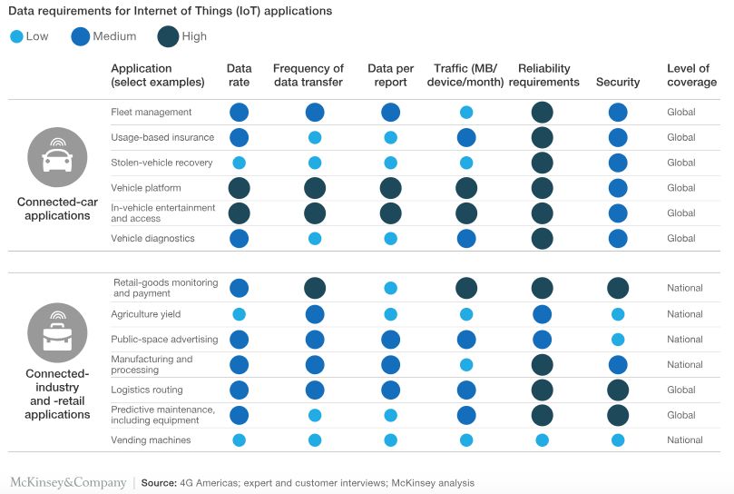 例如,考虑联网汽车领域的要求,其中一家公司可以提供多种物联网应用,包括车队管理,车载娱乐和失窃车辆追回(图表3)。每个用例对速率、传输频率和每个报告的数据都有不同的要求。但是,所有用例都需要相同程度的可靠性,安全性和覆盖范围。相比之下,工业和零售应用程序通常具有截然不同的数据要求,以及对覆盖范围,可靠性和安全性的不同需求。