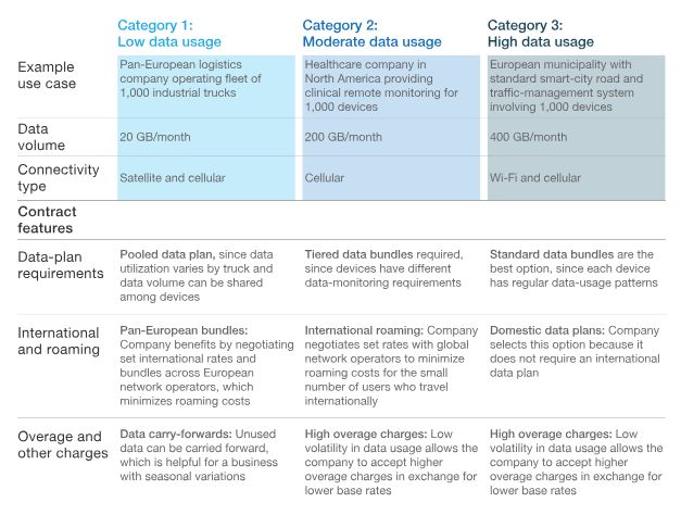 创建定制的定价方案可能看起来任务艰巨,但是可以通过一个简单的方案实现。第一步,公司应确定员工如何在其组织内使用物联网设备,以及客户如何使用其支持物联网的产品。在此分析过程中,他们应关注最重要的用例,这些用例可能与内部操作,客户需求或两者相关。然后,公司可以根据数据需求(低、中、高)将其组织分为三类。漫游和连接要求以及对超额保护的需求可能会在每个类别中有所不同,如图表2所示。