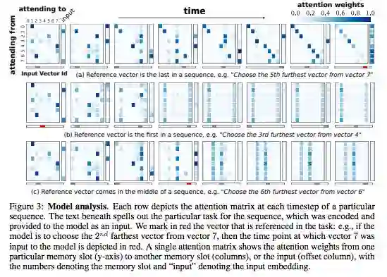 每行描述了特定序列的每个时间步的注意力矩阵。下面的文本阐明了序列的特定任务,该序列被编码并作为输入提供给模型。我们用红色标记任务中引用的矢量。
