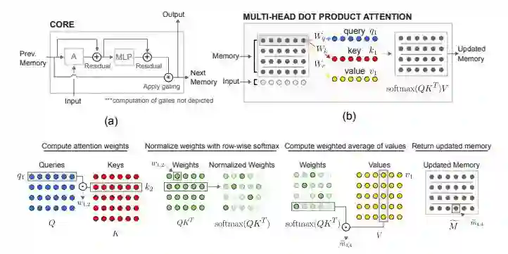 我们的指导设计原则是提供一个架构的主干,在这个基础上,模型可以学习如何划分信息,以及如何计算划分的信息之间的交互。为了实现这一点,我们从LSTM、 memory-augmented神经网络和non-local网络(特别是Transformer seq2seq模型)组装构建块。与记忆增强架构相似,我们考虑一组固定的memory slots;但是,我们允许使用注意里机制在memory slots之间进行交互。与之前的工作相反,我们在单个时间步上在记忆之间应用注意力,而不是跨过在先前的观察中计算出来的所有先前的表征。