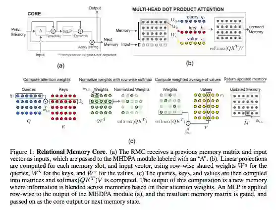 在这篇论文中,DeepMind和伦敦大学学院的研究人员首先证实一种直觉想法,即标准的记忆架构在一些涉及关系推理的任务上很困难。然后,研究者通过使用一个新的记忆模块——Relational Memory Core(RMC)——来改进这种缺陷,该模块采用multi-head dot product attention来允许记忆交互。