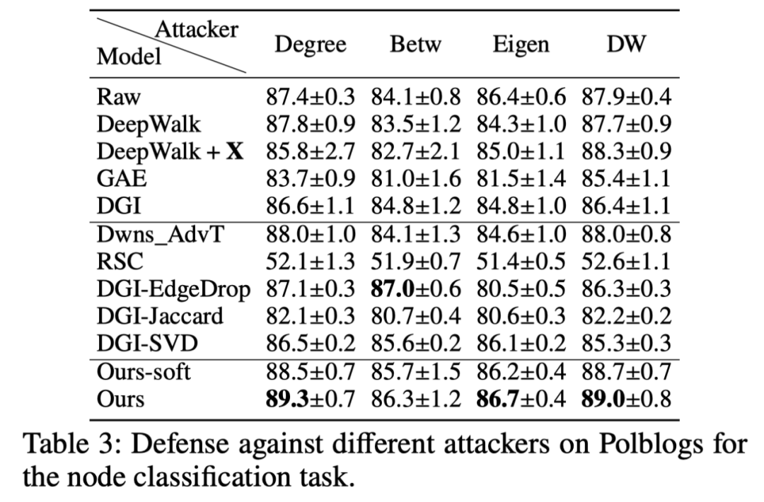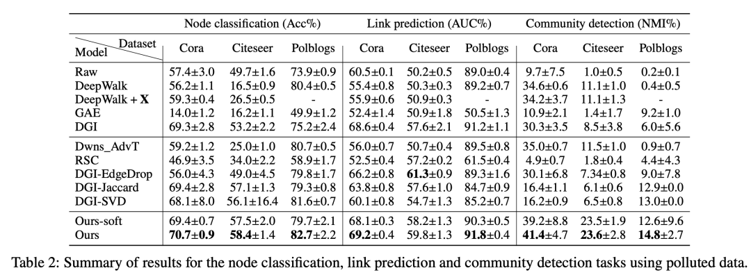 表2:节点分类、链接预测和社区识别任务中的对抗鲁棒性