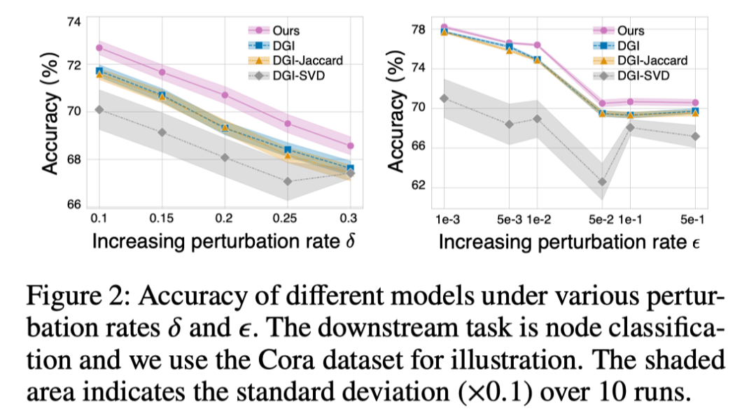 不同下游任务中模型的对抗鲁棒性:如表2所示,文章提出的模型在节点分类、链接预测和社区识别任务上分别比最优基准方法平均高出了+1.8%、+1.8% 和+45.8%。