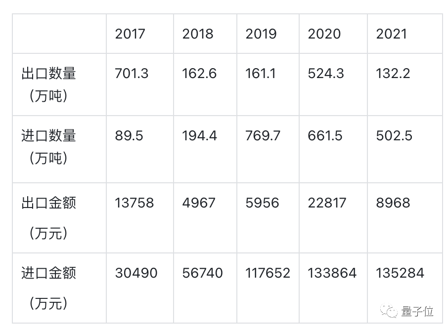而又在去年(2021年),进口数量已经是出口数量的4倍,进口金额也达到了峰值,超13亿元。