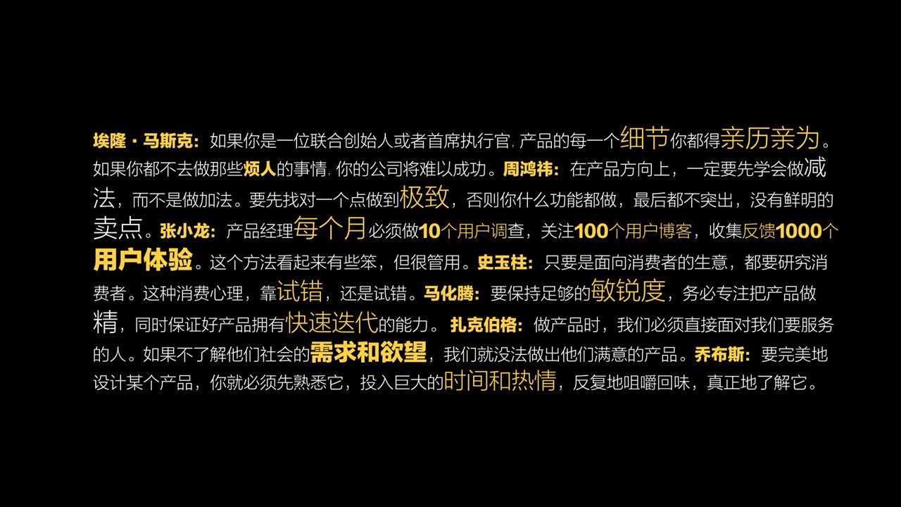 我准备了很长时间,找了世界上最牛逼的产品经理——比如埃隆·马斯克、乔布斯等,去看他们是怎么讲产品的。
