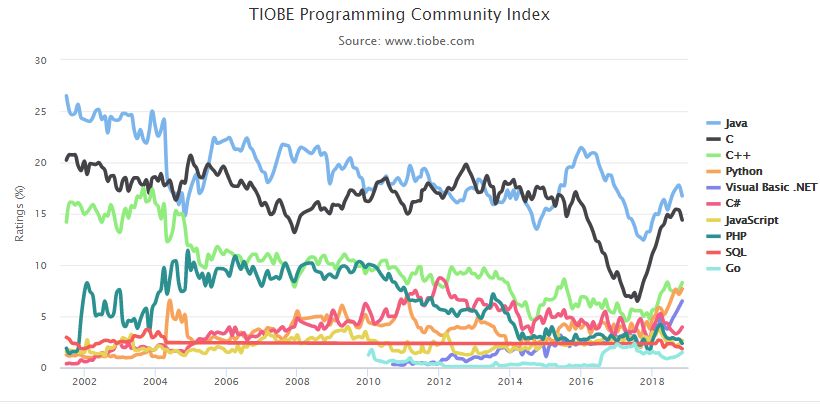 TOP 10 编程语言 TIOBE 指数走势(2002-2018)