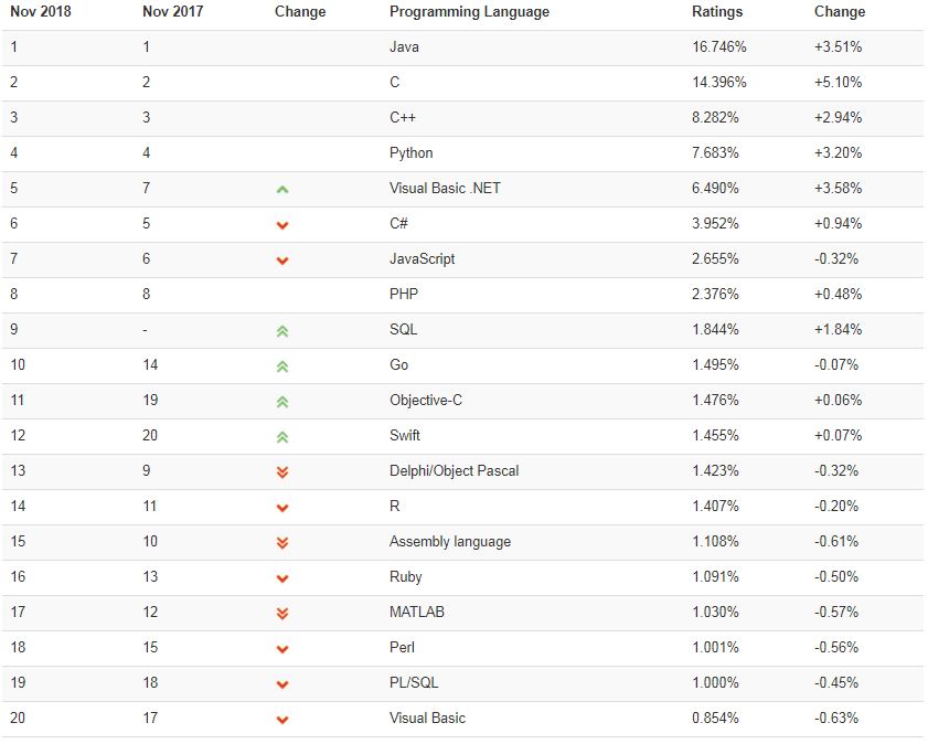 当然,今年也有出现了一些新的编程语言,但它们的普及率太低,暂未称得上“年度编程语言”的称号。例如,上个月,Apex 从第 46 位跃升至第 36 位,而 Alice 则在同一时期从第 62 位跃升至第 44 位。但是这些都不重要,因为两种语言在 2018 年的增幅都不到 0.5%。哪门语言会获胜?我们不妨拭目以待。