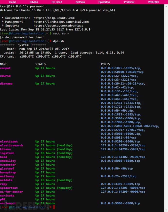 在T-Pot17.10中,作者将docker容器化后的蜜罐、ELK数据日志平台、几个管理工具整合了到一个平台中。