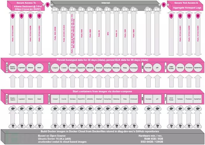 T-Pot17.10基于Ubuntu Server 16.04.x LTS的一个蜜罐平台。 蜜罐程序以及正在使用的其他支持组件使用docker进行了容器化。 我们可以在同一台设备上运行多个蜜罐进程,每个蜜罐占用的空间较小并限制在蜜罐自己的环境中运行。