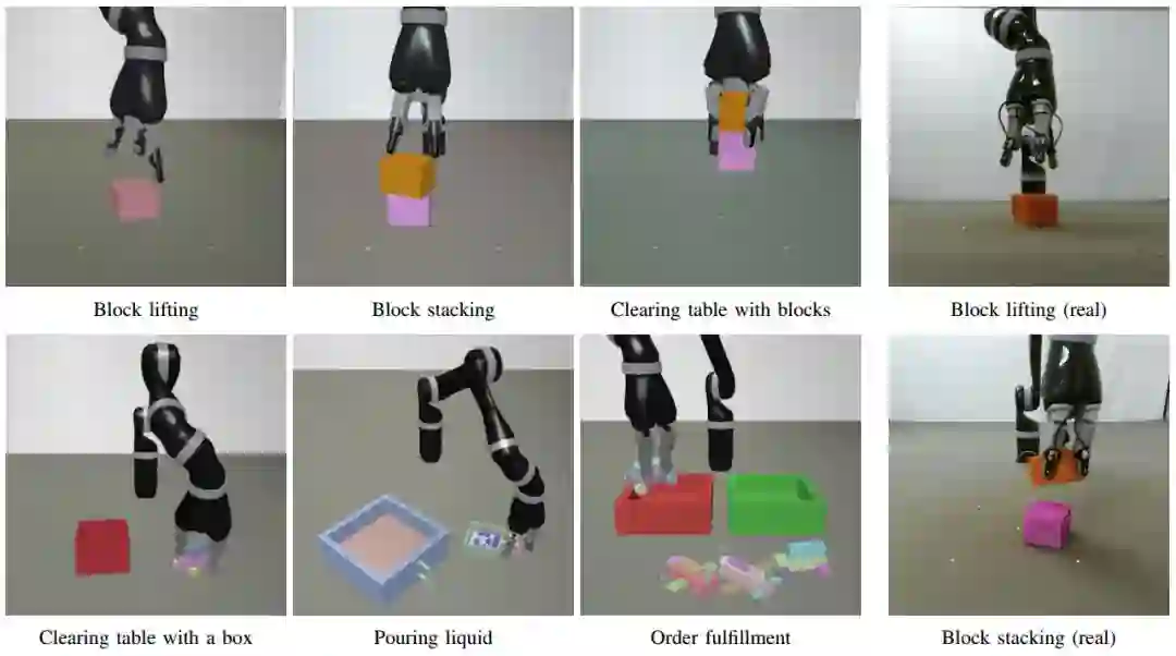 我们对六种操作任务的方法进行了评估,包括提升、堆叠、浇注等。这组任务包括多阶段和长时间任务,并且它们需要直接从像素中进行完整的9-DoF关节速度控制。控制器需要能够处理显著的形状和外观变化。