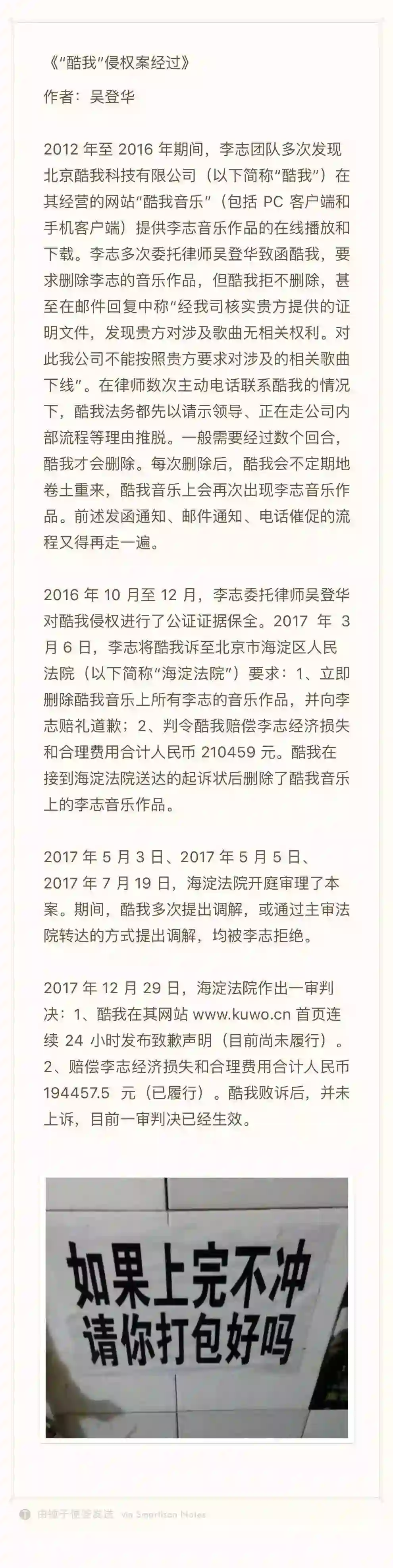 此事终于在2017年12月有了“说法”——海淀法院判决:酷我发致歉声明;赔偿李志19万人民币。
