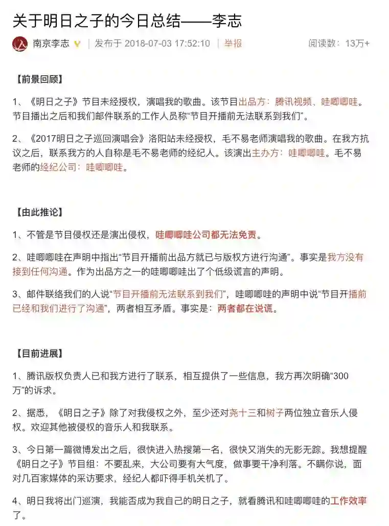今天(7月3日)下午六点左右,李志在微博发了一篇长文,总结了事件过程——