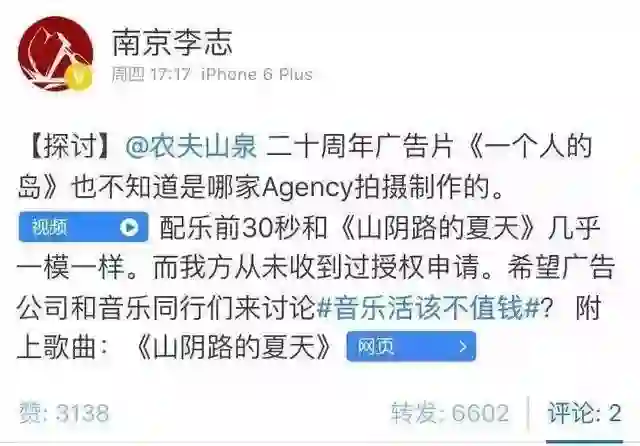 2016年6月,李志发微博称:农夫山泉二十周年广告片配乐的前30秒和《山阴路的夏天》几乎一模一样。