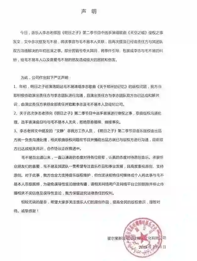 1月20日,毛不易在“明日之子”的巡回演唱会上翻唱了李志原创的《关于郑州的记忆》。1月23日,李志在微博发声: