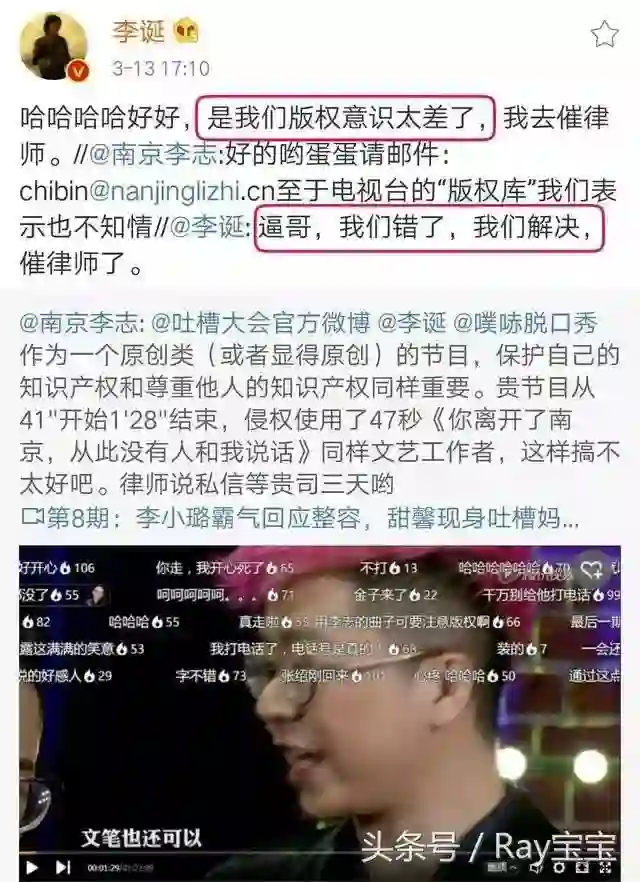 随后,《吐槽大会》的总撰稿人、吐槽团成员李诞(蛋蛋)态度诚恳地认了错:“我们错了,我们解决,催律师了。”