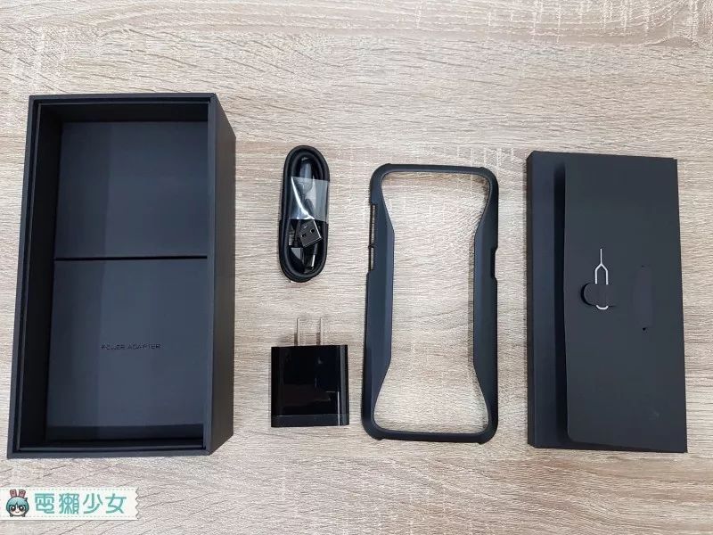 开箱的时候,默默涌出一个想法:「包装真的跟 Razer Phone 好像啊……」,不管是要致敬,或是游戏手机为了呈现酷酷的格调,都是用黑色配件、纸盒来呈现,总之质感是还满不错的