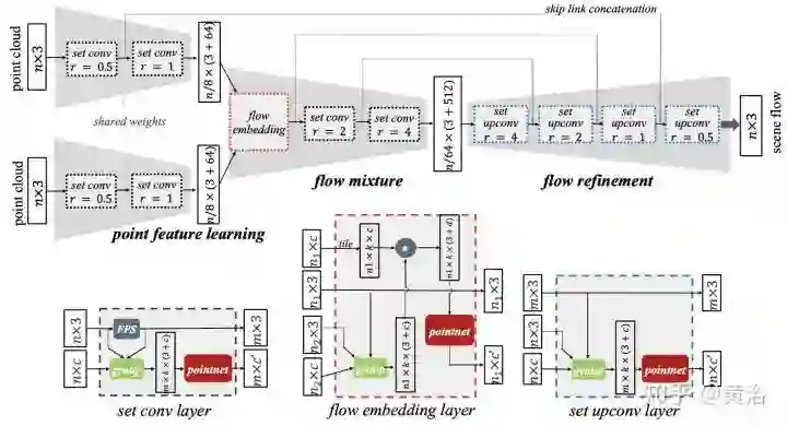 图像像素运动是optic flow,而3-D场景的运动称之为scene flow,如果有激光雷达的点云数据,后者的估计可以通过ICP实现,这里给出一个CNN模型的实现方法FlowNet3D,是PointNet的扩展:
