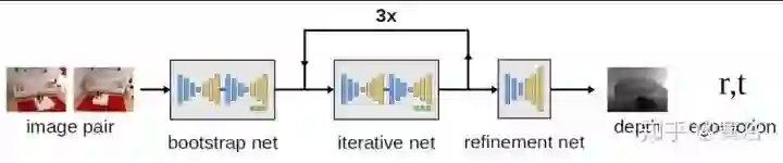 下面给出的是camera motion 的encoder-decoder network框架:三个模型串联,其中一个有迭代。