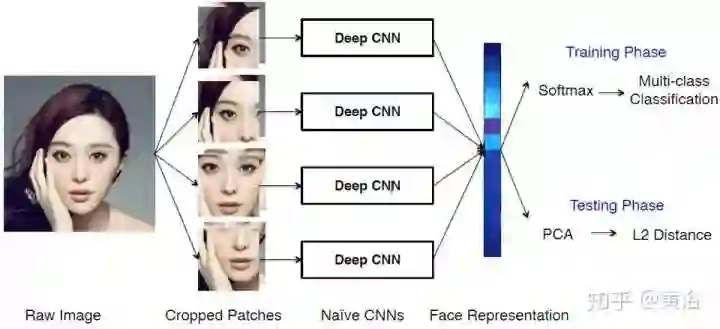 一个完整的人脸识别系统,需要完成人脸检测和人脸校准(face alignment),而后者是需要人脸关键点(facial landmarks)的检测,也是可以基于CNN模型来做。这里以FB的DeepFace模型为例吧,给出一个人脸识别的系统框图: