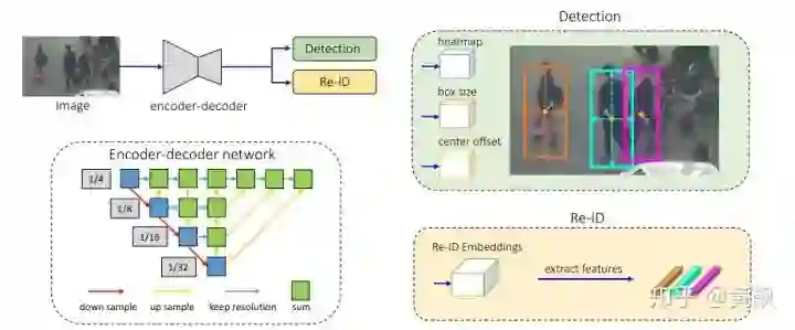 这篇论文的立意是两部分,一个是类似于CenterTrack的基于CenterNet的联合检测和跟踪的框架,一个是类似于JDE,但是却又不同的,探讨了检测框架与ReID特征任务的集成问题。