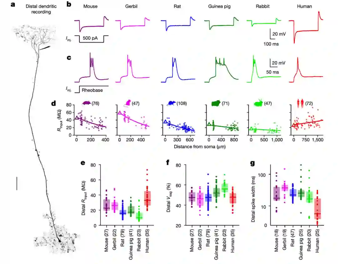 在最新的研究中,研究团队对 9 种不同哺乳动物和人类的第五层锥体神经元进行了比较,希望借此能更全面地了解哺乳动物的神经元生物物理规律。