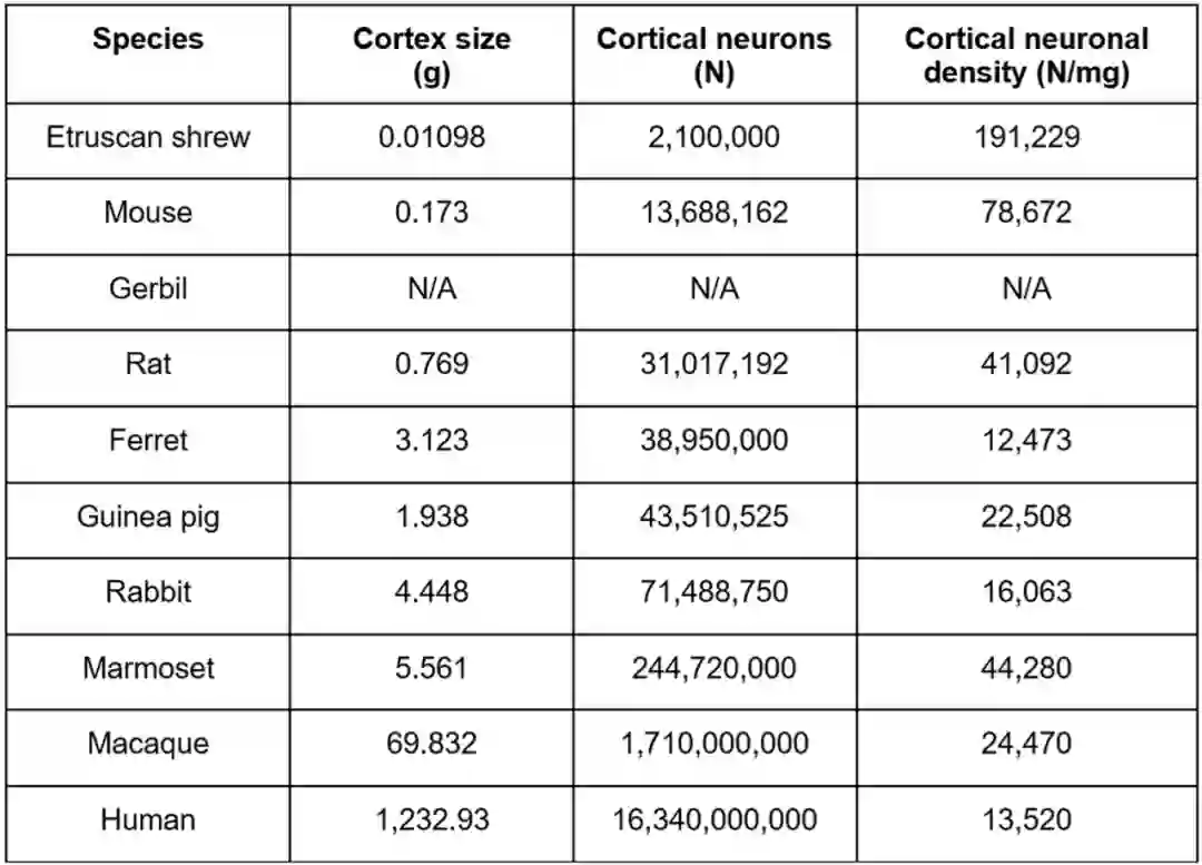 图|哺乳动物大脑皮层和神经元密度数量表(来源:该论文)