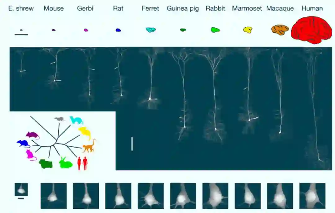 图|人和 9 种哺乳动物的第五层锥体神经元形态比较(来源:该论文)