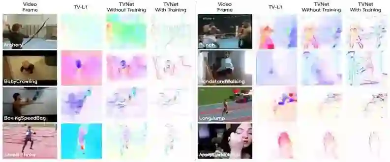 图 1:由 TV-L1、TVNet(无训练)、TVNet(有训练)得到的类光流运动特征的可视化结果