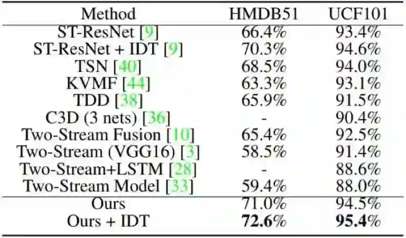 表 4:在 HMDB51 和 UCF101 上的平均分类准确度