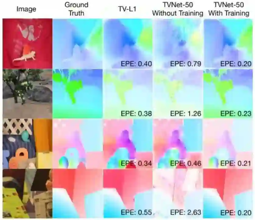 TVNet 是一种特定的光流求解器 TV-L1 方法,并且通过将 TV-L1 中的优化迭代展开成神经层而进行了初始化。因此,TVNet 无需任何额外训练就能直接使用。