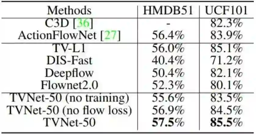 相比于其它动作表征学习的方法(比如 TV-L1、FlowNet2.0 和 3D Convnets),我们的 TVNet 在两个动作识别基准上实现了更优的准确度,即在 HMDB51 上实现了 72.6% 的准确度、在 UCF101 上实现了 95.4% 的准确度。