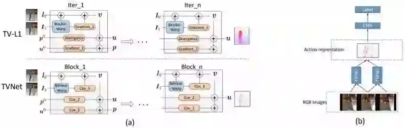 图 2:(a)将 TV-L1 展开成 TVNet 的过程示意图。对于 TV-L1,我们只描述了算法 1 中的单次迭代。我们将 TV-L1 中的双三次翘曲(bicubic warping)、梯度和散度计算重新形式化为了 TVNet 中的双线性翘曲(bilinear warping)和卷积运算。(b)用于动作识别的端到端模型。