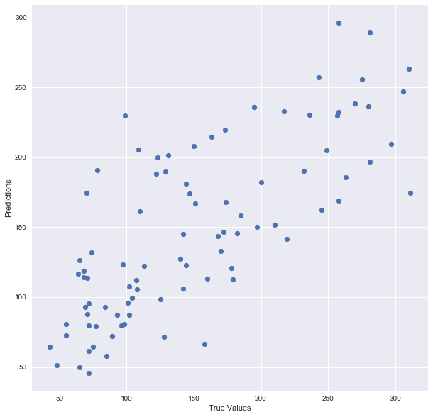 之前我们演示了用函数划分糖尿病数据集的结果,这里我们尝试对它做交叉验证,看看有什么不同。首先,我们可以用cross_val_predict函数返回测试子集中每个数据点的预测值。
