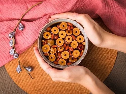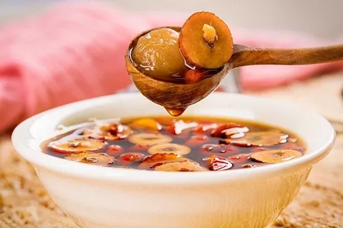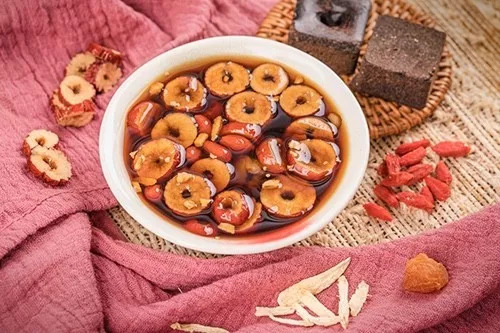 皮薄、肉厚、有嚼劲,里面有丰富的铁元素,红枣浸了黑糖水,也更香糯。