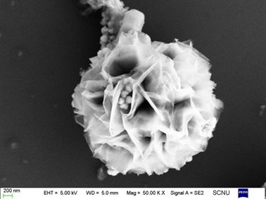 水热法制备的MoS2/Fe3O4复合纳米材料。二硫化钼纳米花犹如玫瑰花花瓣,中间的四氧化三铁纳米球则如玫瑰花的花芯。