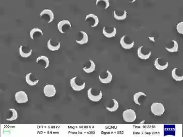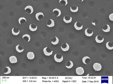 在圆孔中组装聚苯乙烯小球,在表面镀上上一层金属,形成月牙形结构。
