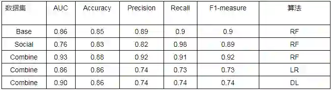 后面三组数据是在整合数据集上应用三种不同算法,整体表现逻辑回归算法较弱,深度学习居中,随机森林表现最优。结果表明目前模型输入特征与预测目标关联性较好,并且总体特征数量为数十个的量级,还不足以发挥深度学习海量特征无监督优化选择的特性,相比之下随机森林、GBDT[10]等集成学习算法表现更为突出。