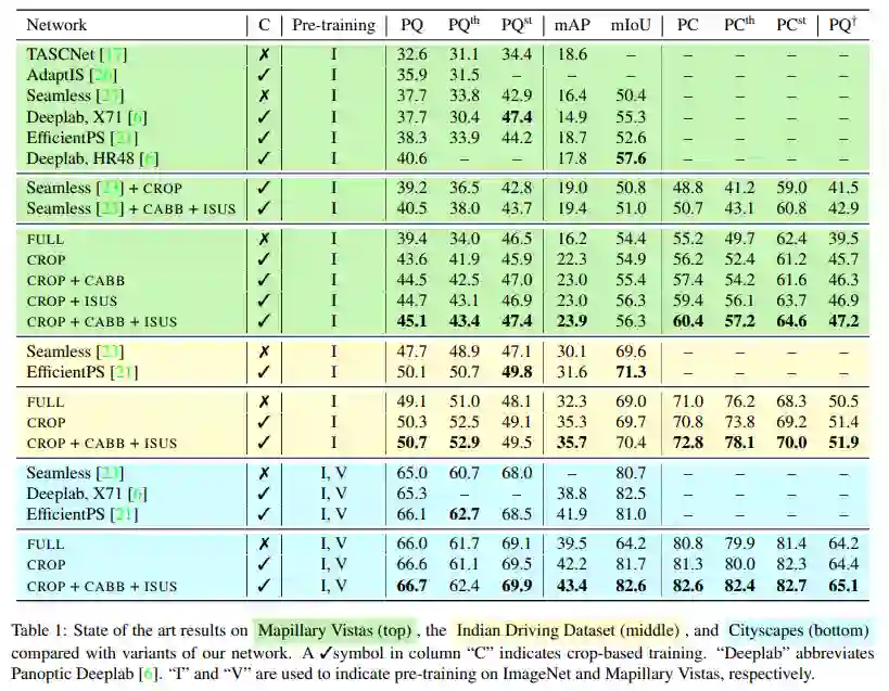,这证明了基于 crop 训练的优势。除此以外,即使是该网络变体中最弱的,也超过了所有的 PQ 基准,唯一的例外是基于 HRNet-W48 的 Panooptic Deeplab 版本。