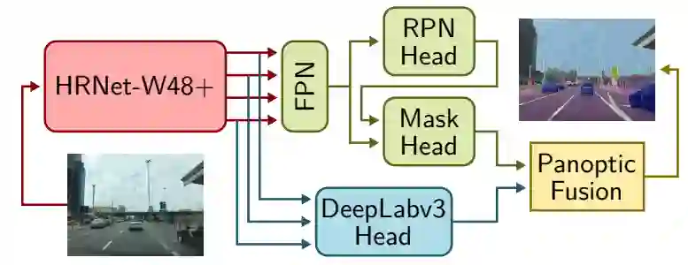 该研究遵循无缝场景分割(Seamless-Scene-Segmentation)[23]框架,并进行了修改。首先,研究者用 HRNetV2-W48+[28,6]替换 ResNet-50 主体,前者是一种专门的骨干网络,它保存从图像到网络最后阶段的高分辨率信息;其次,研究者将 [23] 中的 Mini-DL 分割头替换为 DeepLabV3+[4]模块,该模块连接到 HRNetV2-W48 + 主干。最后将同步的 InPlace-ABN [25]应用于整个网络,并在候选区域和目标检测模块中使用 CABB 损失替换标准边界框回归损失。