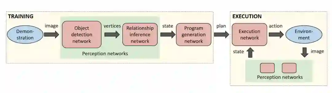 该方法的工作方式:一个摄像机被用来捕获场景的实时视频流,并且通过两个神经网络实时地对场景中对象的位置和关系进行推断。由此产生的知觉被输入到另一个网络中,该网络生成一个解释如何重建这些感知的计划。 最后,一个执行网络读取该计划并为机器人生成动作,同时考虑到当前场景的状态,以确保对外部干扰的稳健性。