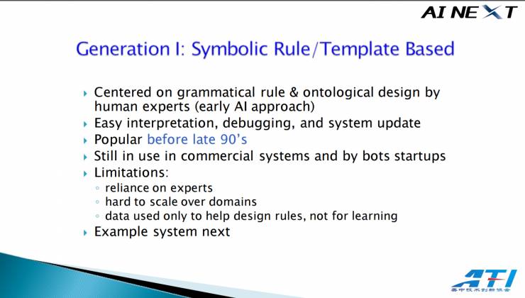首先,第一代技术从 1980 年代末开启,在流行度上面,几年前这一波技术就可以说是结束了,虽然你能够发现一些商用系统和 bot 初创企业还在使用它们。这代技术依赖于专家人工制定的语法规则和本体设计(ontological design)。这些规则很容易解释、理解,比较透明,这就是这代技术为什么能催生出一系列的成功商业应用的原因。修补漏洞很容易,系统更新也很容易。