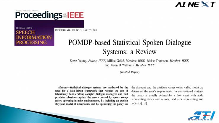 这篇论文(“POMDP-based statistical spoken dialogue systems:a review”)对第二代技术做了整体归纳,它发表的时间是 4 年前(2013),恰恰在深度学习登场之前。这篇论文是剑桥大学的成果,他们做了很多努力来把该系统商业化。