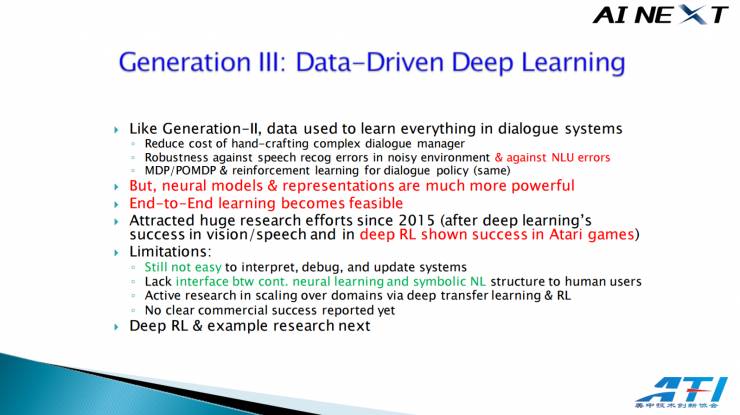 第三代技术用深度学习取代了浅层学习的部分。和第二代技术一样,数据被用来学习对话系统中的所有东西。第三代的神经模型和表示远远比前两代要强大,端到端的学习也变得可行。从两年前开始,它吸引了全世界范围内巨大的研究兴趣。但它也有许多局限性:
