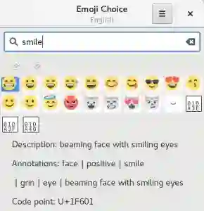 现在 emoji 输入法启用了,按键盘快捷键 Ctrl+Shift+E 搜索 emoji。将出现一个弹出对话框,你可以在其中输入搜索词,例如 “smile” 来查找匹配的符号。