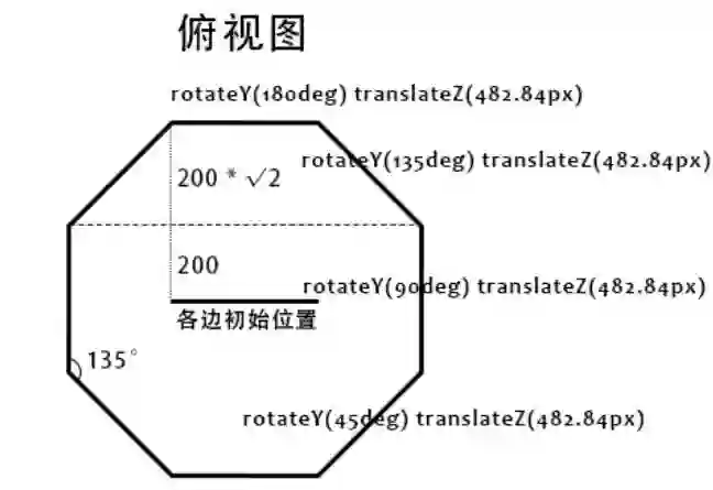 如果是一张图需要分割成八份,假设每张图分割出来的高宽为 400 400 , 8 张图需要做的操作是依次绕 Y 轴旋转 [45°, 90°, 135°, 180°, 225°, 270°, 315°, 360°] ,偏移的距离为 translateY(482.84px) ,也就是 (200 + 200√2)。