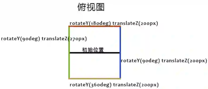 以上述 Demo 中的正方体为例子,class 为 img 的 div 块的高宽为 400px*400px。那么要利用 4 个 这样的 div 拼接成一个正方体,需要分别将 4 个 div 绕 Y 轴旋转 [90°, 180°, 270°, 360°],再 translateY(200px) 。