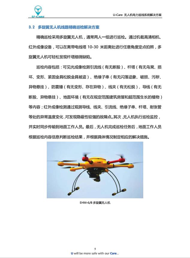 U-Care无人机电力巡线系统,由无人机、无人机地面控制器、运行与监控中心(综合管理终端)、U-Care云服务器(公有云/私有云)构成。
