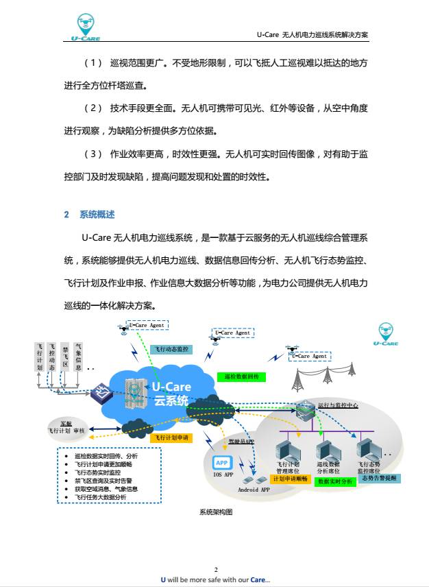 U-Care无人机电力巡线系统是一款基于云服务的无人机巡线综合管理系统,系统能够提供无人机电力巡线、数据信息回传分析、无人机飞行态势监控、飞行计划及作业申报、作业信息大数据分析等功能,为电力公司提供无人机电力巡线一体化解决方案。